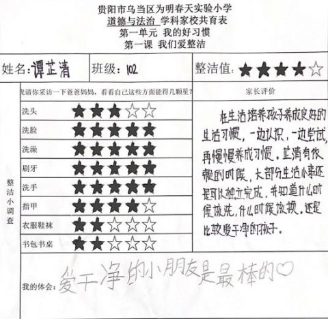 时光荏苒,一转眼,新学期开始了。为了进一步促进家校沟通,让各位家长能够更清楚地了解孩子本学期在校表现和学习生活情况,春天校区道德与法治组的老师以制订“整洁小调查表”为契机,着力“五育并举”,加强“五项管理”,开展家校共育活动。