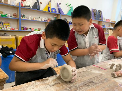 陶艺选修课程中孩子们大胆想象,结合花瓶的功能进行设计和创作各种风格的创意花瓶。