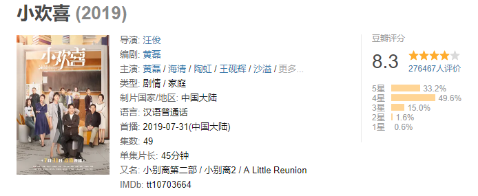 《小欢喜》播出后,豆瓣评分也飙升至8.3,对这部剧情的频繁的评价莫过于“真实”两个字,火的原因,应该就是引起了无数人的情感共鸣!